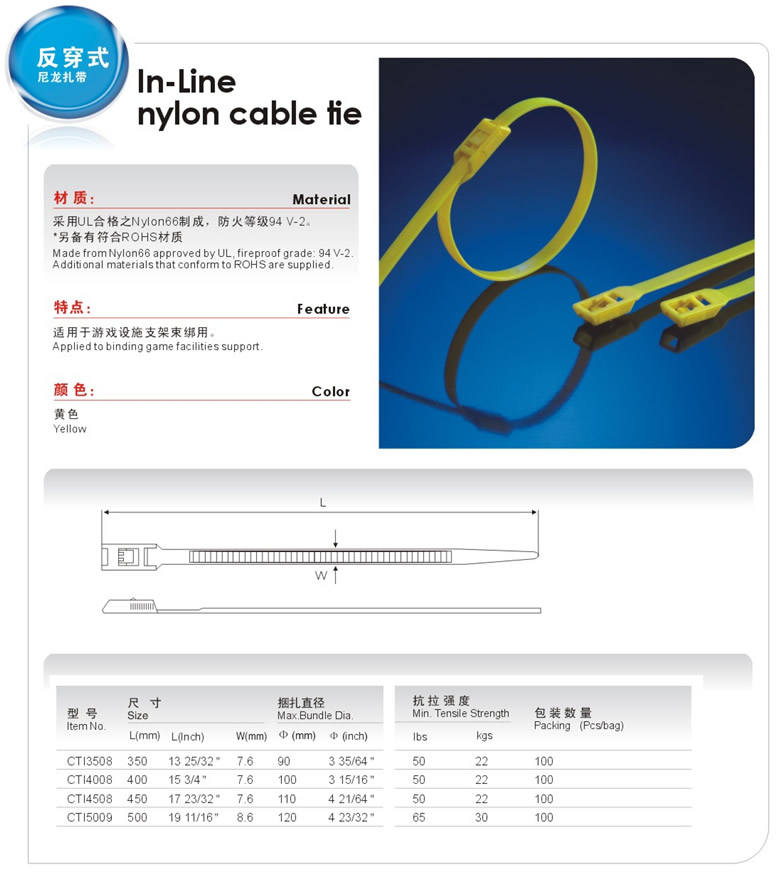 產品材質:尼龍扎帶采用UL認可尼龍66(Nylon 66)材料注塑制成,防火等級94V-2,具有良好的耐酸、腐蝕、絕緣性,不易老化、承受力強。操作溫度為-20℃到+80℃(普通尼龍66)。